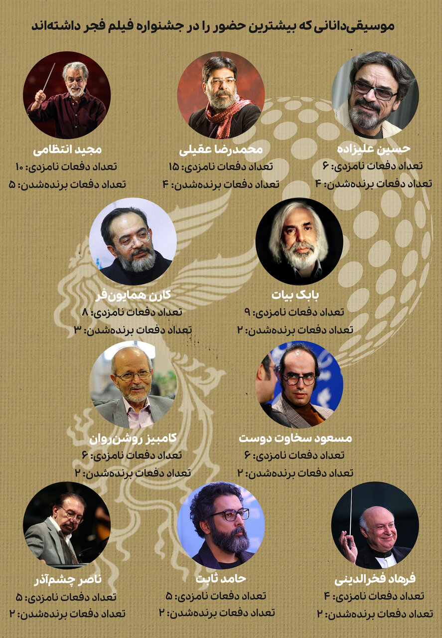 در تمام سالهای جشنواره فیلم فجر ، آهنگسازان برجسته مانند مجید انتزامی ، محمد رضا آقایلی ، حسین آلیزاد ، کارن هومایونفار ، باباک بیات ، کامبیز روزانوان ، مسعود وهراوات داست ، ناصر چشمار ، هامدا موسیقی را گرفته است.