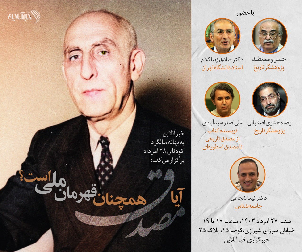 چسرو معتزاد; پژوهشگر تاریخ، صادق زیباکلام; رضا مختاری اصفهانی، استاد علوم سیاسی دانشگاه تهران; پژوهشگر تاریخ علی اصغر سیدآبادی; نویسنده کتاب «از مصدق تاریخی تا مصدق اسطورهای»