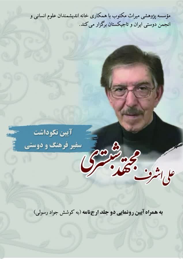 گروه اندیشه: پژوهشکده میراث مکتوب با همکاری خانه اندیشمندان علوم انسانی و انجمن دوستی ایران و تاجیکستان ضمن گرامیداشت سی و سومین سالگرد برقراری روابط جمهوری اسلامی ایران و جمهوری تاجیکستان و تأسیس سفارت در شهر دوشنبه «آیین نکوداش سفیر فرهنگ و دوستی» علی اشرف مجتهد شبستری را برگزار می کند.