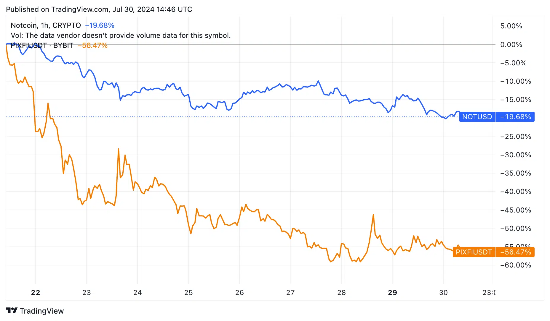 بررسی دادهها نشان میدهد که توکنهای محبوب Notcoin، Avacoin و Pixelverse از زمانی که فهرست شدهاند، عملکرد خوبی نداشتهاند. نوت کوین که در ماه مه فهرست شده بود، با 55.8 درصد کاهش به 0.012 دلار رسید. حتی پس از اقدامات اخیر برای رشد اکوسیستم، ارزش بازار آن از بیش از 2.5 میلیارد دلار به 1.32 میلیارد دلار کاهش یافته است. به طور مشابه، توکن Pixelverse (PIXFI) به 0.030 دلار کاهش یافته است که 70 درصد از بالاترین قیمت خود در ماه جاری کاهش یافته است و ارزش بازار آن را به 160 میلیون دلار کاهش داده است.