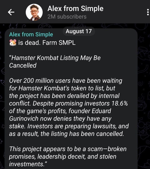 مدیر پروژه Simple همچنین افزود که سرمایه گذاران در حال آماده سازی شکایت های حقوقی هستند و در نتیجه، لیست Hamster Kombat لغو شده است. به نظر می رسد این پروژه یک کلاهبرداری با وعده های دروغین، فریب رهبری و سرمایه گذاری های دزدیده شده است!