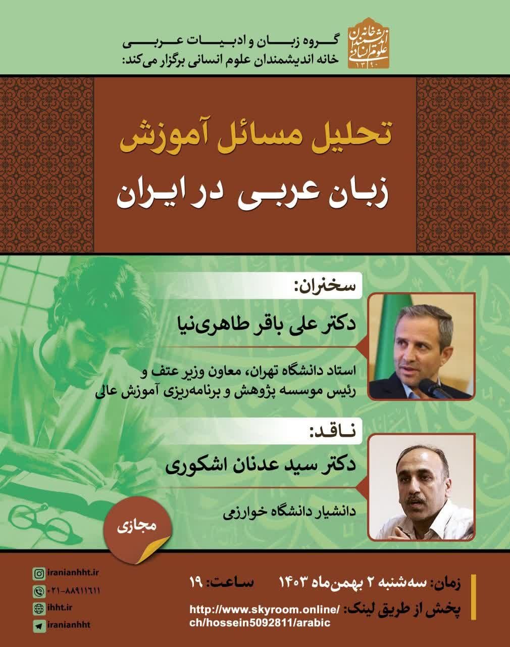 گروه اندیشه: نشست «تحلیل مسائل آموزش زبان عربی در ایران» با حضور دکتر علی باقری طاهرینی و دکتر سید عدنان اشکوری در خانه اندیشمندان علوم انسانی برگزار می شود.