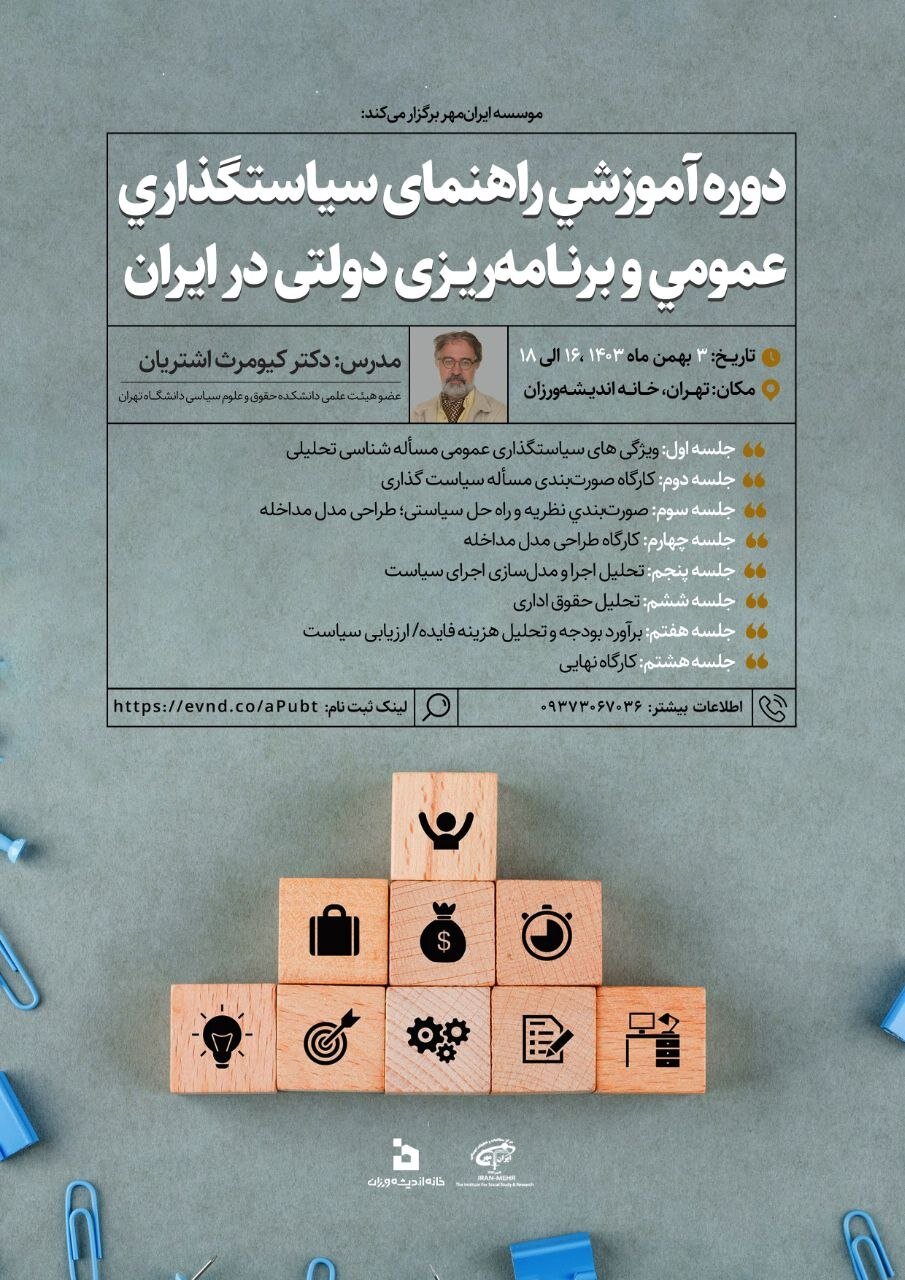 گروه فکر: موسسه ایران مهر کارگاه آموزشی سیاست های عمومی و برنامه ریزی دولت در ایران را در 8 جلسه برگزار می کند.