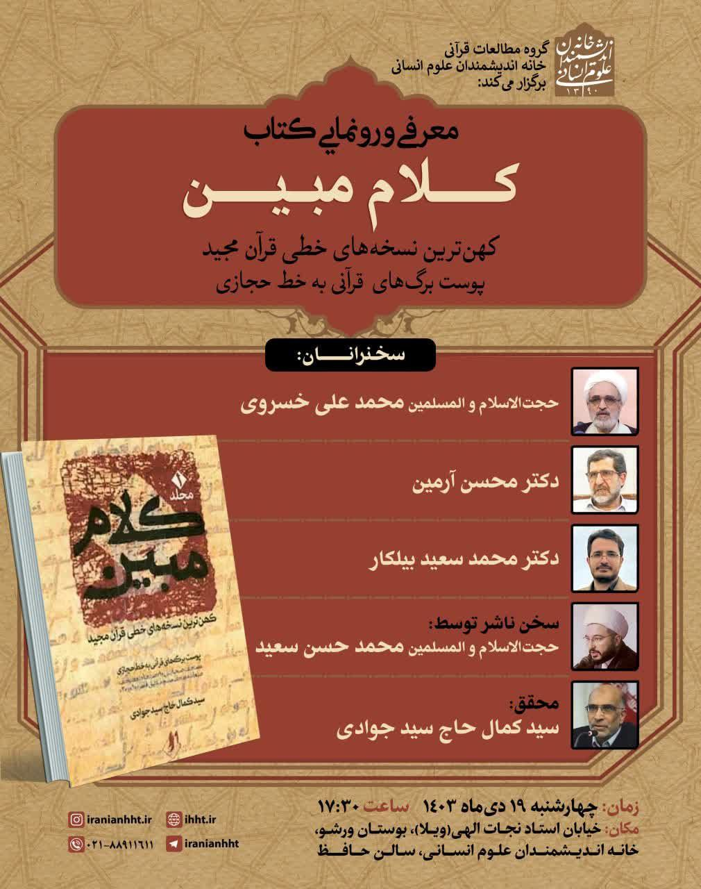به گزارش خبرگزاری اخبار آنلاینخانه اندیشمندان علوم انسانی، مراسم معرفی و رونمایی از کتاب «کلم مبین» را برگزار می کند.