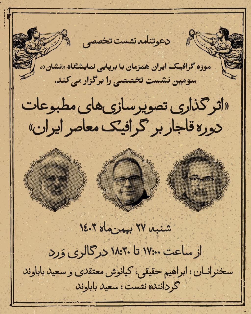 این جلسه پس از دو جلسه تخصصی در مورد “بررسی ویژگی های چاپ و چالش های طراحان و تصویرگران مطبوعات قاجار” و “تجزیه و تحلیل خصوصیات نوشتن و بصری علائم مطبوعاتی دوره” که قبلاً برگزار شده بود ، دنبال می شود.