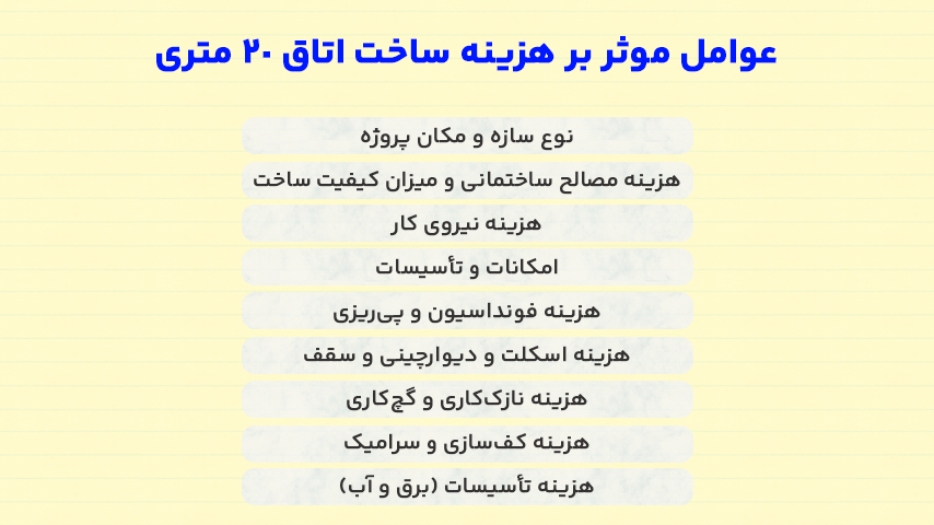 هزینه ساخت یک اتاق 20 متری(محاسبه 0 تا 100 هزینه ساخت)