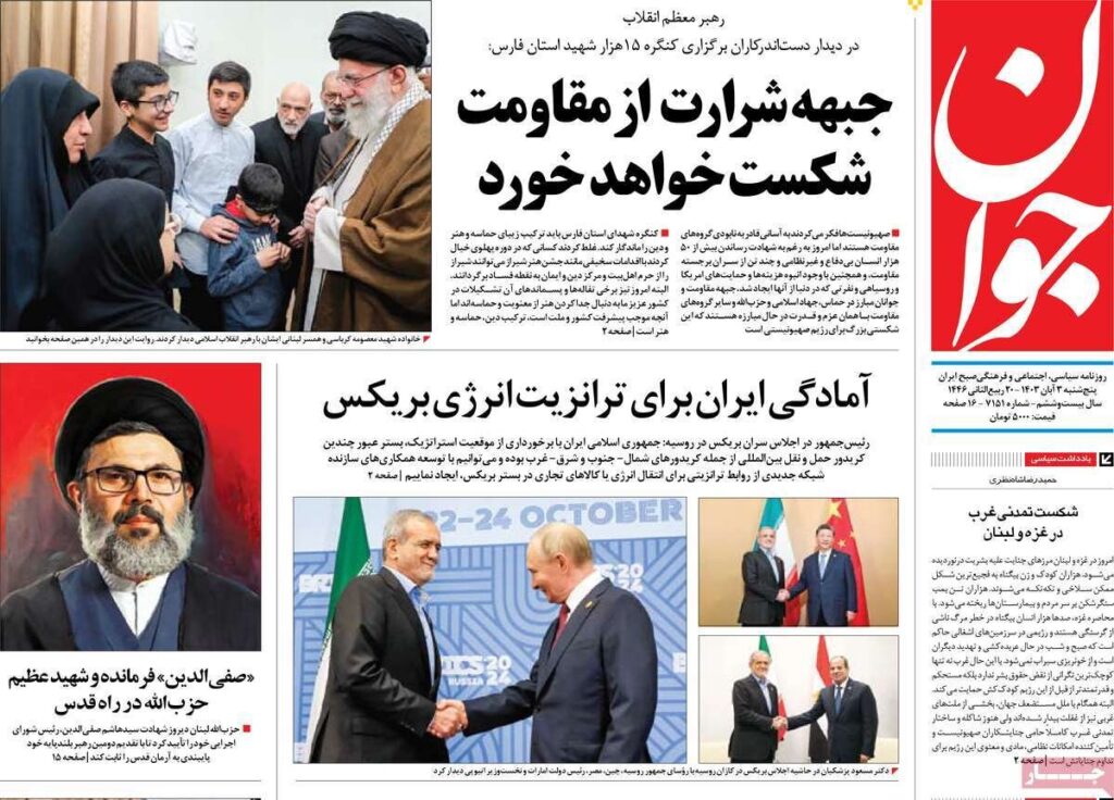 بیانات مهم رهبر معظم انقلاب در جبهه مقاومت و پیشنهادات پنجگانه ایران به اجلاس بریکس تیترهای برجسته مطبوعات کنونی را به خود اختصاص داده است.