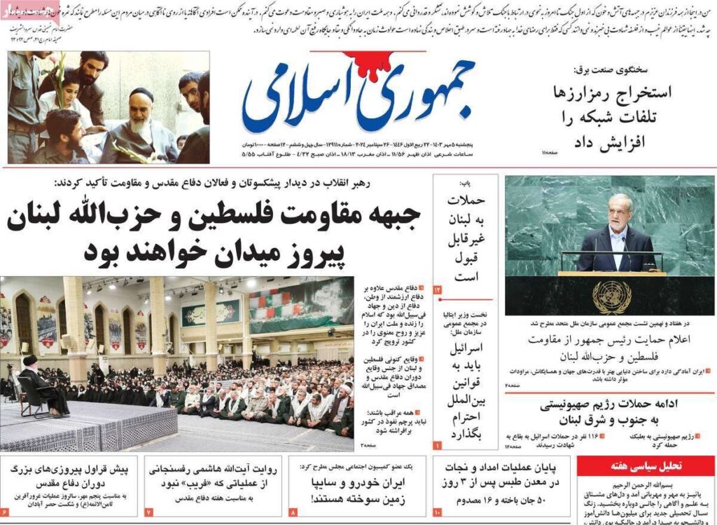 بیانات مهم سرانقلاب درباره مقاومت در منطقه، سخنرانی پزشکان در سازمان ملل و… آنها در میان تیترهای مطبوعات فعلی ظاهر می شوند.