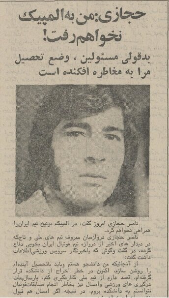 به گزارش خبرگزاری اخبار آنلاینروز چهارشنبه 13 مرداد 1351، ناصر حجازی دروازه بان 23 ساله تیم تاج و تیم ملی ایران در مصاحبه ای اعلام کرد که در بازی های المپیک مونیخ …