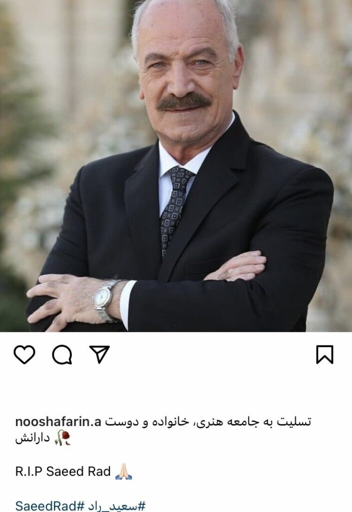 به گزارش خبرگزاری فارسیرو، نوش آفرین همسر سابق سعید راد در صفحه اینستاگرام خود درگذشت این هنرمند را تسلیت گفت و نوشت: تسلیت به جامعه هنری، خانواده و دوستان ایشان نوش افرین …