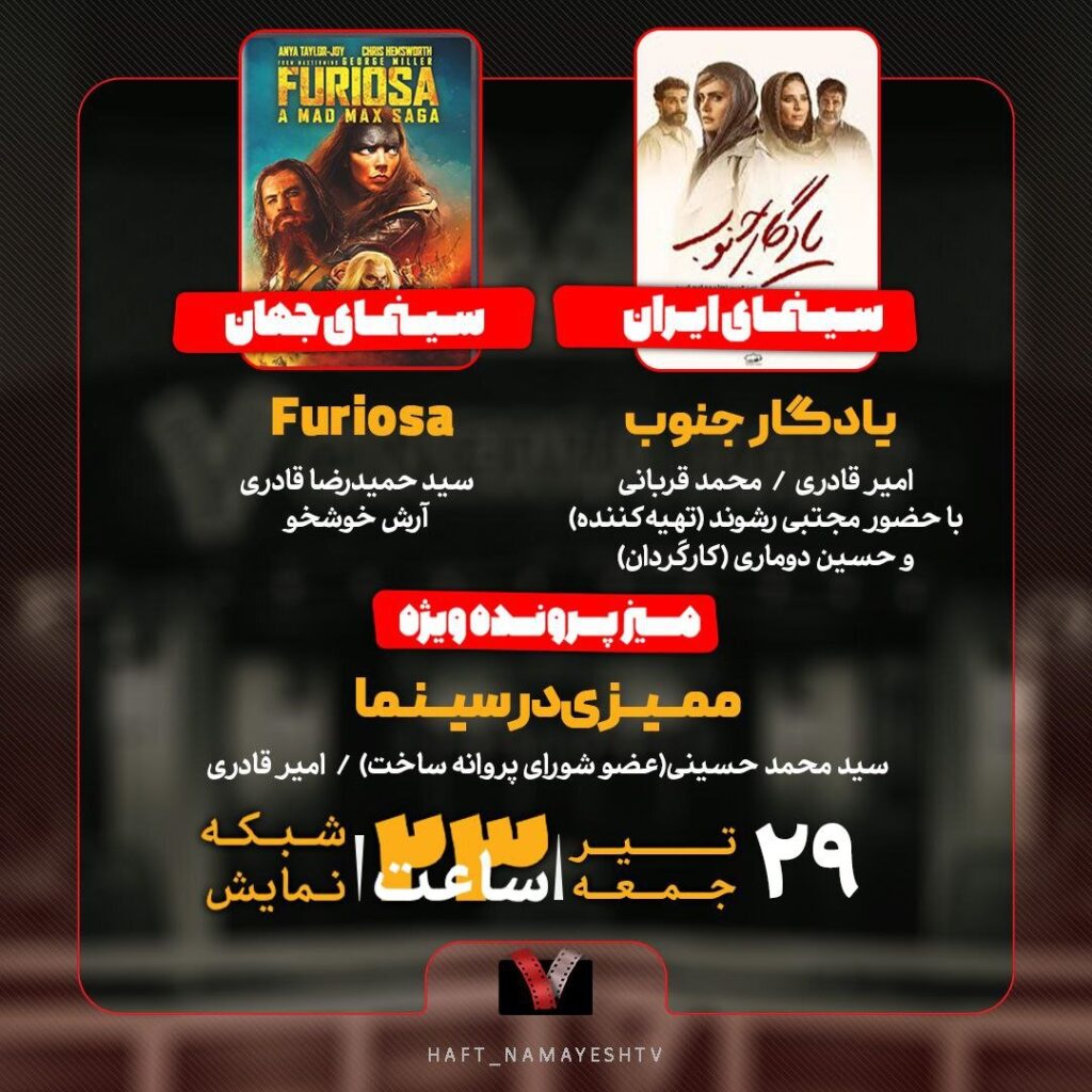 امشب نهم تیرماه، دهمین قسمت از برنامه «هفت» با نقد و بررسی فیلم «یادبود جنوب»، نقد و بررسی فیلم «فوریوسا» و پرونده ویژه «ممیزی سینما» پخش می شود.
