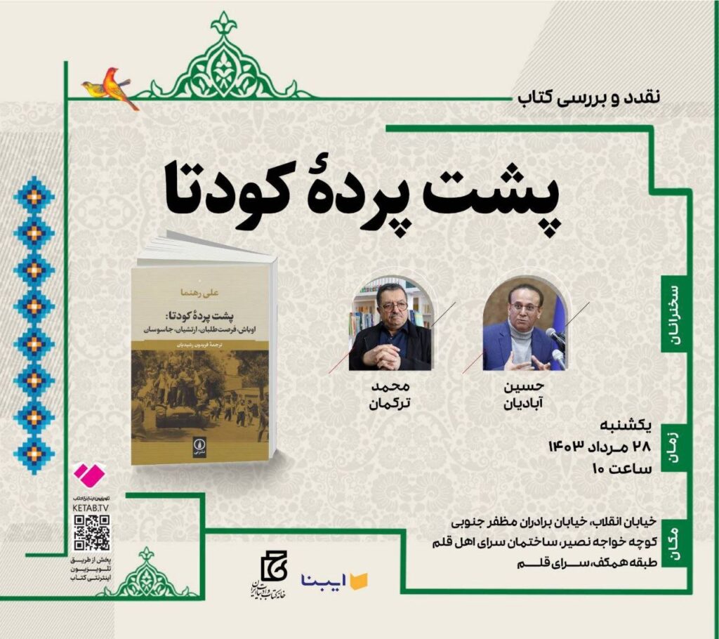 به گزارش خبرگزاری فارسیرو، نشست نقد و بررسی کتاب «پشت پرده کودتا» نوشته علی رهنما یکشنبه 7 مردادماه ساعت 10 صبح به دبیری آژانس کتاب ایران برگزار می شود. محل برگزاری این …